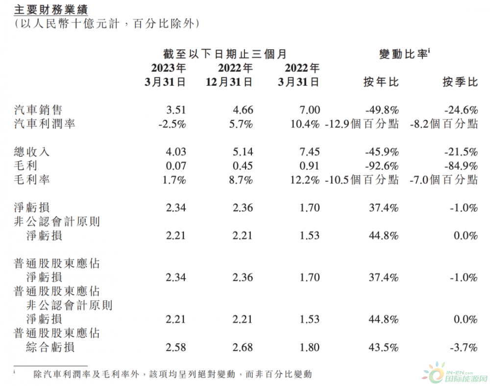 何小鹏身价大跌与小鹏汽车的发展不无关系。日前,小鹏汽车公布一季度财报显示,报告期内总营业40.3亿元,同比下滑45.9%,其中汽车销售收入35.1亿元,同比下滑49.8%;净亏损达23.4亿元,同期净亏损17.0亿元,亏损同比扩大37.4%;更危险的是,小鹏汽车当季整体毛利率暴跌至1.7%,其汽车毛利率更是跌至-2.5%,这是小鹏近三年以来首次出现负数汽车毛利率。同时,小鹏汽车对于二季度业绩也表现出极度悲观,其预计二季度营收45亿元至47亿元,同比减少约36.8-39.5%。