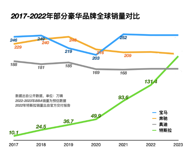 下图更加直观,特斯拉陡峭上升的销量曲线,让已经困在销量瓶颈多年的BBA如坐针毡。大胆预测,2023年,特斯拉全球销量将有望超越奔驰、宝马和奥迪,成为全球最畅销的豪华品牌车企。