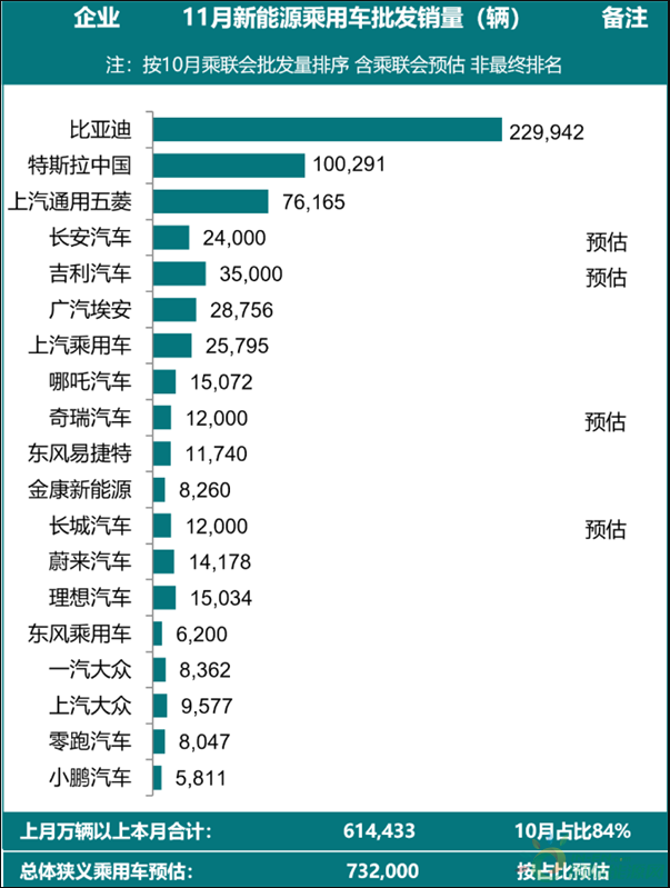 日前,乘联会公布了2022年11月新能源乘用车厂商批发销量快讯。