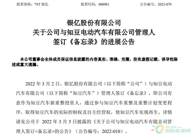 今年3月2日,*ST银亿发布公告称,公司拟出资不超过4亿元参与知豆汽车重整及重整计划变更程序,进而取得知豆汽车的实际控制权及自主经营权,使得知豆汽车实现再生。