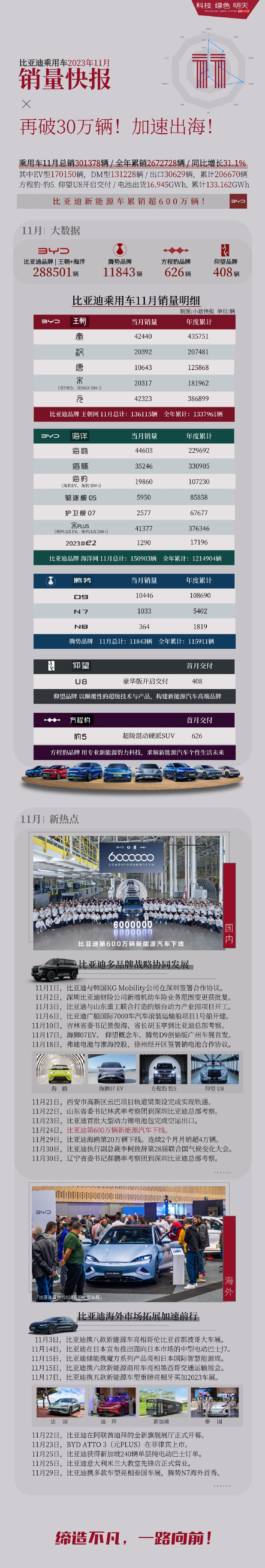 12月1日消息,比亚迪股份有限公司今晚在港交所公告,11 月公司新能源车销量 301903 辆;1-11 月新能源车销量 2683374 辆。其中,新能源乘用车销量为 301378 辆,本年累计 2672728 辆。