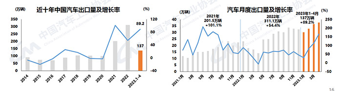 5月11日,中汽协发布汽车产销数据。2023年4月,汽车产销分别完成213.3万辆和215.9万辆,同比分别增长76.8%和82.7%;新能源汽车产销分别完成64万辆和63.6万辆,同比均增长1.1倍;汽车企业出口37.6万辆,同比增长1.7倍。